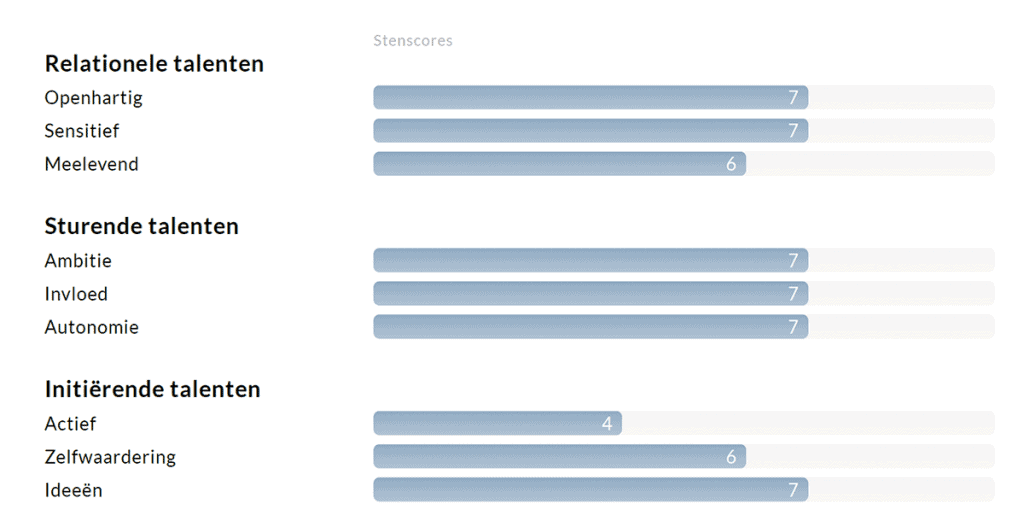 Het rapport geeft niet alleen inzicht in jouw kwaliteiten, maar ook in de valkuilen en drijfveren. Daarnaast worden de leerstijlen benoemd en worden er suggesties gedaan met betrekking tot de te volgen ontwikkelingsstrategie. Tot slot bevat het rapport een aantal reflectievragen, waarmee je zelf aan de slag kunt.