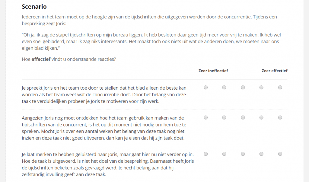 Je krijgt in de rol van leidinggevende een aantal scenario’s voorgelegd. Onder elk scenario zijn een aantal mogelijke reacties weergegeven; jij dient de effectiviteit van elk van de reacties op deze situatie te beoordelen. Deze test is gebaseerd op het full range leadership model van Bass & Avolio (1990), waardoor deze test een goede onderbouwde theoretische basis heeft.